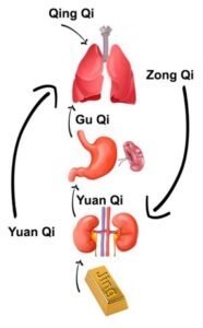 Los alimentos ingeridos se reciben en el Estómago y es el Bazo el encargado de separar su esencia para transportarla a Pulmón en forma de Gu Qi. Es ahí, en Pulmón, donde se producirá la unión de Gu Qi y Qing Qi para formar Zong Qi.