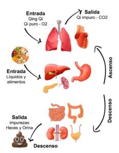 Así el Qi puro del aire o Qing Qi entra en los pulmones con su O2 y, tras todo un proceso de transformaciones bioquímicas, desde los pulmones se expulsa Qi impuro con su CO2.